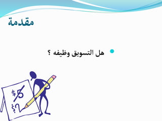 التسويق هو عملية إدارية واجتماعية تهدف إلى تلبية احتياجات الأفراد والمجموعات من خلال تبادل المنتجات ذات القيمة. يتضمن التسويق استراتيجيات متعددة تشمل تصميم المنتجات، التسعير، الترويج، والتوزيع لتحقيق الرضا لدى المستهلكين. الفرق بين التسويق والبيع هو أن التسويق يركز على الاحتياجات والرغبات بينما البيع يركز على تبادل السلع والخدمات مقابل النقود.