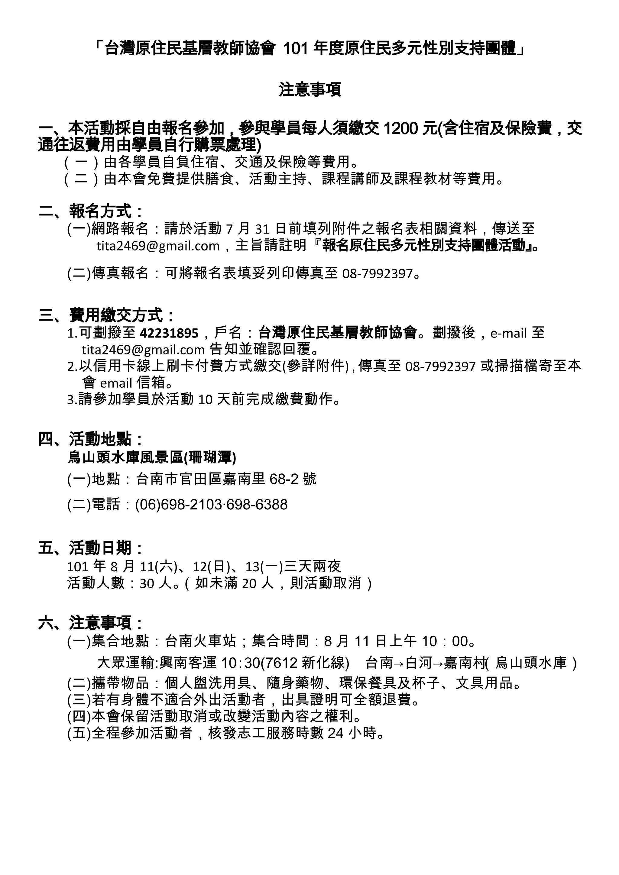 台灣原住民基層教師協會舉辦的活動將於101年8月11日至13日進行,參加者需繳交1200元費用,包括住宿與保險,活動地點在烏山頭水庫。報名透過網路或傳真方式,活動將提供餐食、課程和主持,但交通費自理。參加者需攜帶個人用品及提前10天完成繳費,若人數不足20人則會取消活動。