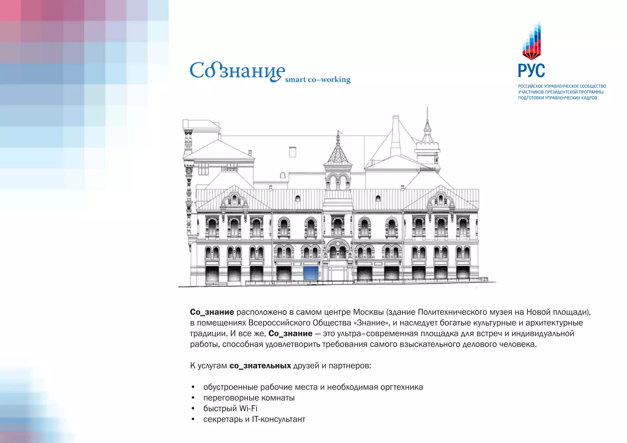 Сообщество «знание» — это новая ко–воркинг площадка в Москве, расположенная в политехническом музее, предлагающая современные рабочие пространства и услуги для деловых людей. Площадка предоставляет обустроенные места, переговорные комнаты, IT-консультантов и организацию мероприятий, а также предлагает различные клубные карты для доступа. Часы работы со_знания — с 10:00 до 24:00, контактное лицо — Ирина Потапова.