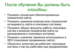 Документ представляет собой учебный материал по сбалансированным показателям сайтов и SEO, описывающий ключевые термины и концепции, влияющие на видимость сайтов в поисковых системах. После обучения читатели должны быть способны объяснять клиентам работу поисковых систем и важность определенных показателей для ранжирования. Основное внимание уделяется уникальности контента, внутренней и внешней оптимизации, а также постоянному улучшению всех показателей сайта.