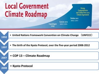 文档概述了气候变化的国际条约历史及德班的气候行动。德班市采取多项措施应对气候变化,包括加入ICLEI、举办气候峰会和实施适应策略。同时,德班会议讨论了全球减排目标及成立绿基基金等重要事项。