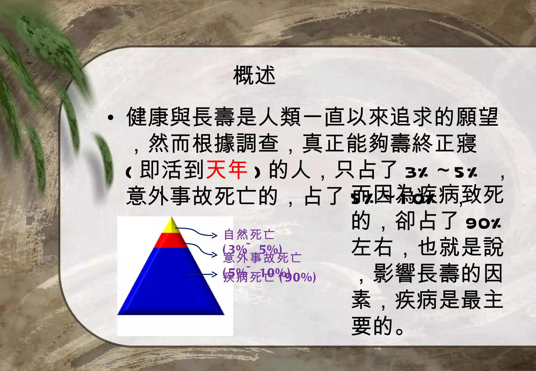 本文件探讨了药膳养生的重要性,强调健康和长寿的关键在于掌握养生之道。中医通过长期实践形成的理论体系,提供了多种养生方法,包括药食、气功和按摩等。文中还介绍了中药的应用、注意事项以及常见病症的预防保健等内容。