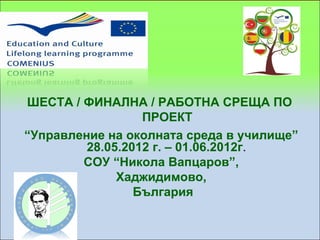 / РАБОТНА СРЕЩА ПО ПРОЕКТ “Управление на околната среда в училище” 28.05.2012 г. – 01.06.2012г. СОУ “Никола Вапцаров”, Хаджидимово, България