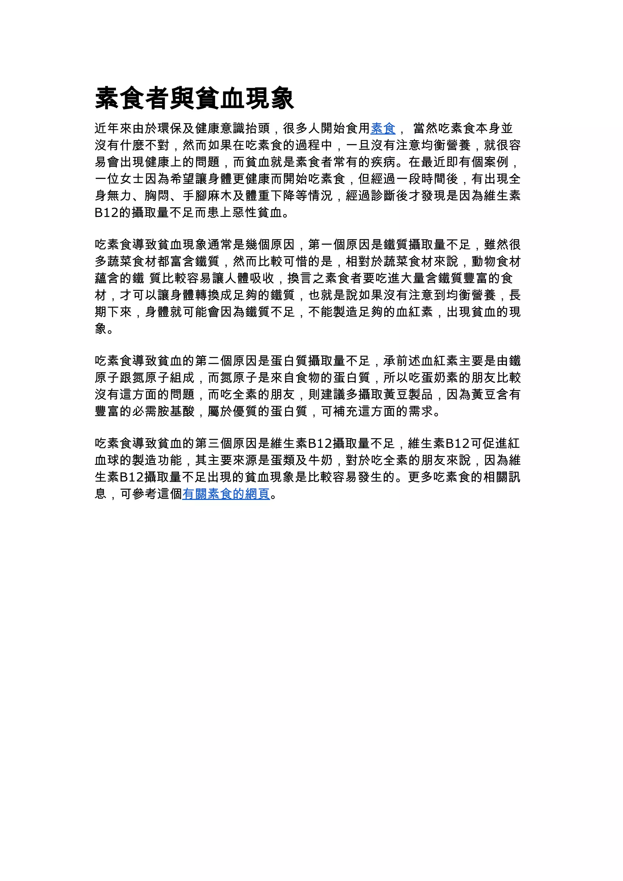 素食者與貧血現象 近年來由於環保及健康意識抬頭,很多人開始食用素食, 當然吃素食本身並 沒有什麼不對,然而如果在吃素食的過程中,一旦沒有注意均衡營養,就很容 易會出現健康上的問題,而貧血就是素食者常有的疾病。在最近即有個案例, 一位女士因為希望讓身體更健康而開始吃素食,但經過一段時間後,有出現全 身無力、胸悶、手腳麻木及體重下降等情況,經過診斷後才發現是因為維生素 B12的攝取量不足而患上惡性貧血。 吃素食導致貧血現象通常是幾個原因,第一個原因是鐵質攝取量不足,雖然很 多蔬菜食材都富含鐵質,然而比較可惜的是,相對於蔬菜食材來說,動物食材 蘊含的鐵 質比較容易讓人體吸收,換言之素食者要吃進大量含鐵質豐富的食 材,才可以讓身體轉換成足夠的鐵質,也就是說如果沒有注意到均衡營養,長 期下來,身體就可能會因為鐵質不足,不能製造足夠的血紅素,出現貧血的現 象。 吃素食導致貧血的第二個原因是蛋白質攝取量不足,承前述血紅素主要是由鐵 原子跟氮原子組成,而氮原子是來自食物的蛋白質,所以吃蛋奶素的朋友比較 沒有這方面的問題,而吃全素的朋友,則建議多攝取黃豆製品,因為黃豆含有 豐富的必需胺基酸,屬於優質的蛋白質,可補充這方面的需求。 吃素食導致貧血的第三個原因是維生素B12攝取量不足,維生素B12可促進紅 血球的製造功能,其主要來源是蛋類及牛奶,對於吃全素的朋友來說,因為維 生素B12攝取量不足出現的貧血現象是比較容易發生的。更多吃素食的相關訊 息,可參考這個有關素食的網頁。