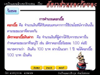 อัตราดอกเบียเงินกู้ คือ จานวนเงินที่ผู้กู้จะต้องจ่ายเงินให้แก่เจ้าของเงิน