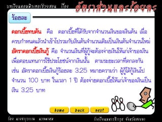 ดอกเบีย คือ จานวนเงินที่ได้รับตอบแทนจากการใช้ประโยชน์จากเงินนั้น