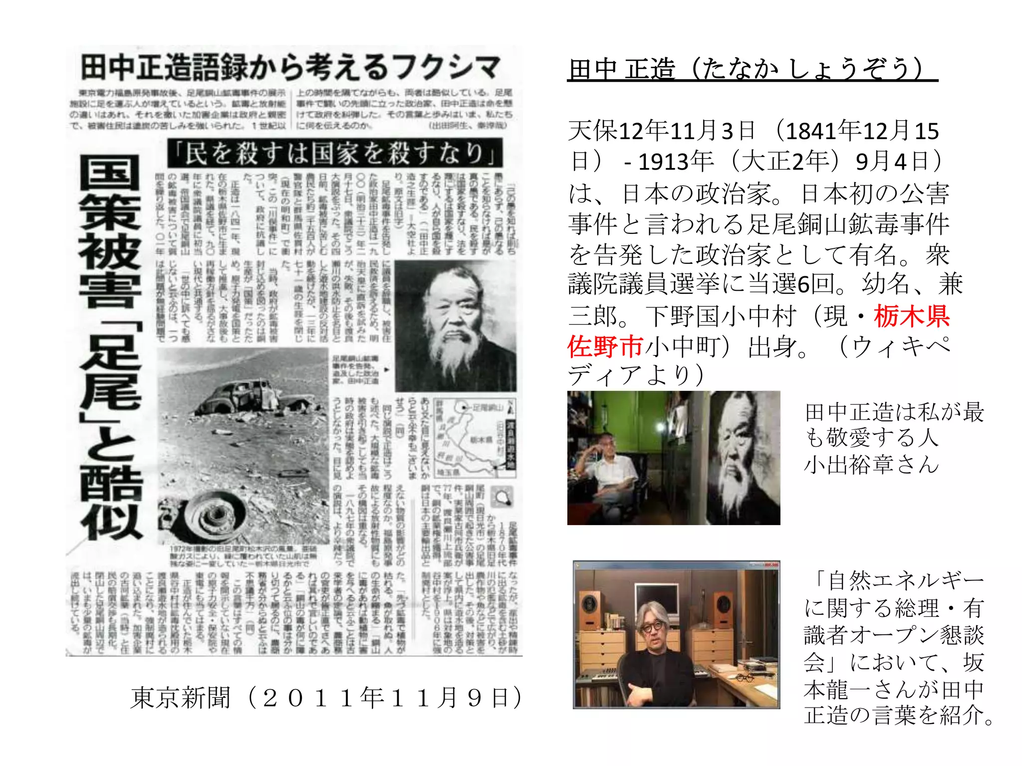 天保12年11月3日(1841年12月15 日) - 1913年(大正2年)9月4日) は、日本の政治家。日本初の公害 事件と言われる足尾銅山鉱毒事件 を告発した政治家として有名。衆 議院議員選挙に当選6回。幼名、兼 三郎。下野国小中村(現・栃木県 佐野市小中町)出身。(ウィキペ ディアより) 田中正造は私が最 も敬愛する人 小出裕章さん 「自然エネルギー に関する総理・有 識者オープン懇談 会」において、坂 東京新聞(2011年11月9日) 本龍一さんが田中 正造の言葉を紹介。