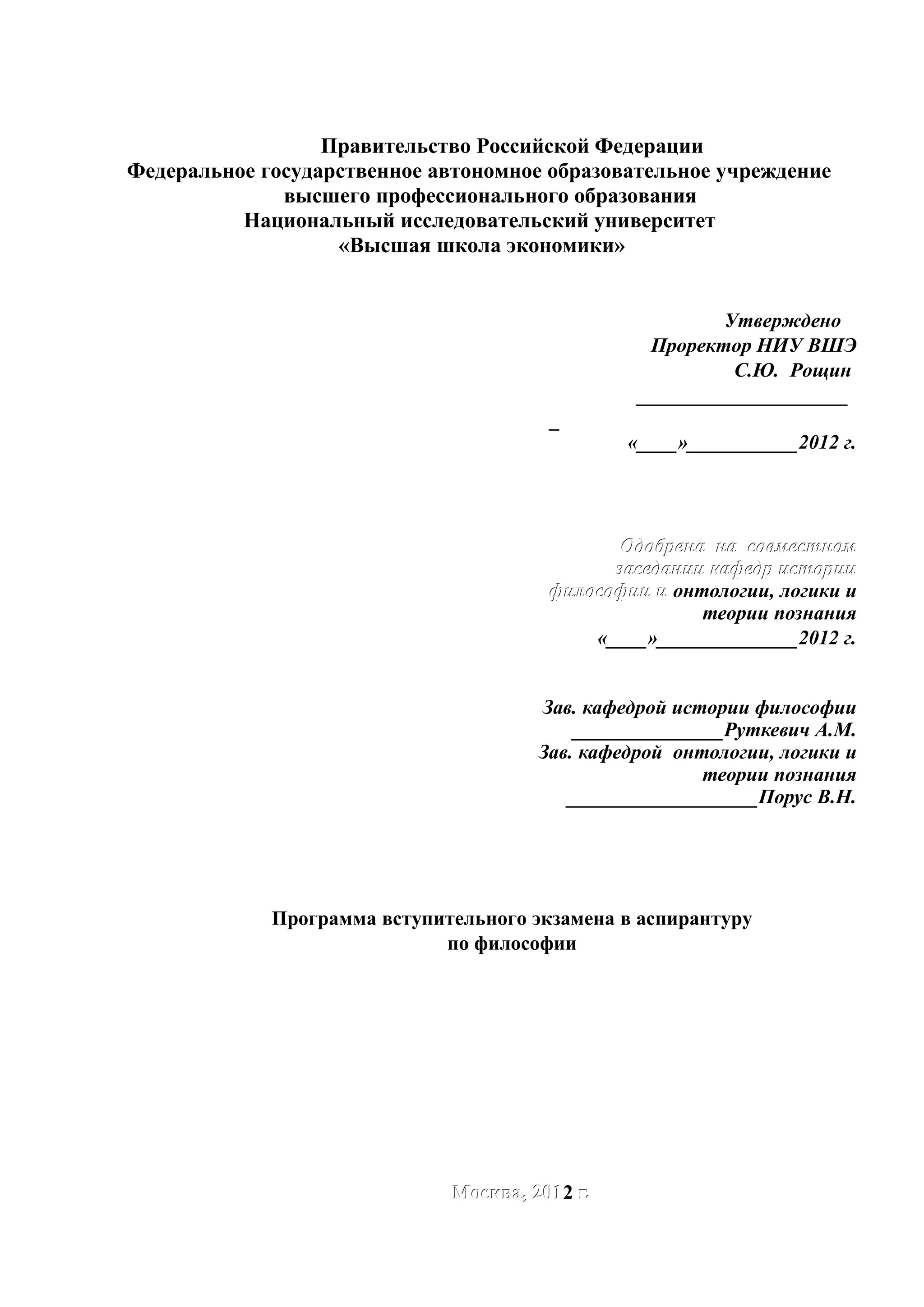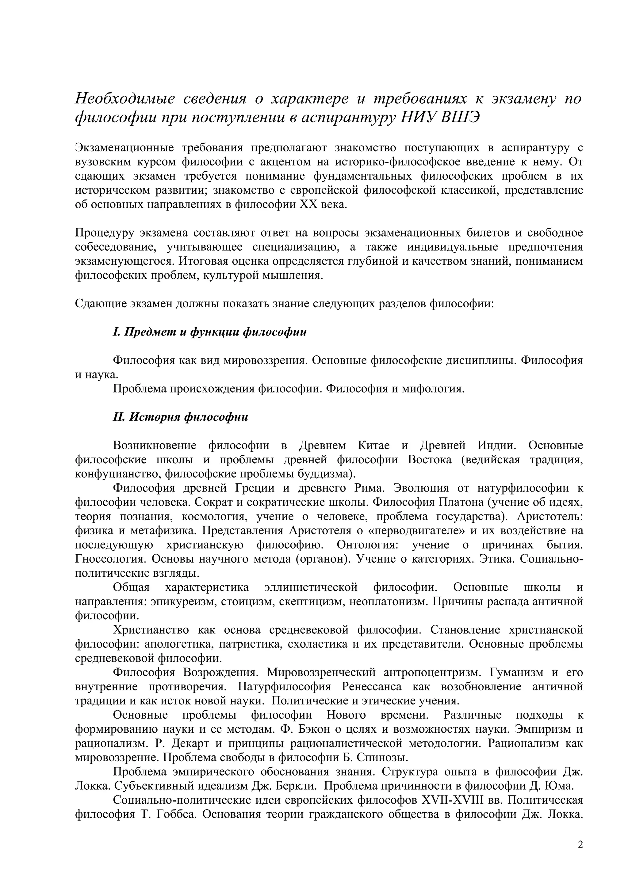 Документ содержит программу вступительного экзамена в аспирантуру по философии в НИУ ВШЭ, охватывающую основные философские школы, исторические этапы и ключевые концепции от древности до современности. Экзаменационные требования включают знание основных philosophical понятий, проблем и направлений философской мысли, а также умение анализировать и обсуждать философские идеи. Программа также включает методические рекомендации и список рекомендуемой литературы для подготовки к экзамену.