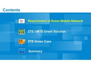 This document discusses ZTE's UMTS green speed solution for mobile networks. It proposes making networks more energy efficient and environmentally friendly through green equipment, green network construction, green power supply, and green supply chain approaches. Specifically, it suggests decreasing site numbers and increasing antenna sensitivity to lower energy consumption. It also promotes high efficiency power amplifiers, intelligent carrier shutdown when traffic is low, and software-defined radio platforms to smoothly evolve networks over time with minimal hardware upgrades. The goal is to lower the total cost of ownership for mobile operators through reduced site deployment, material and power usage while still providing high quality coverage and services.