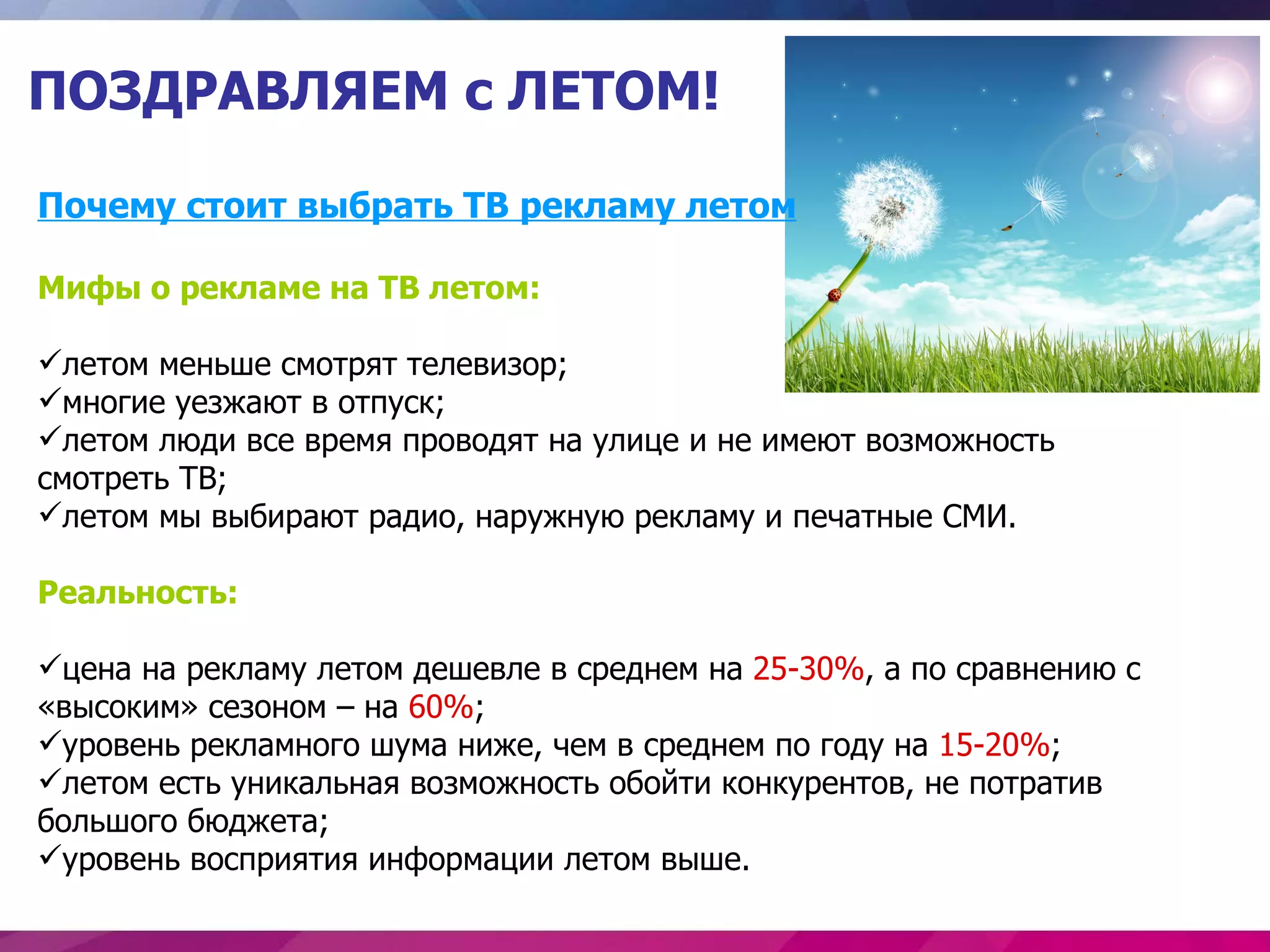 Документ обсуждает преимущества размещения телевизионной рекламы летом, опровергая мифы о снижении аудитории и предлагая экономическую выгоду от снижения цен на 25-30%. В нем подчеркивается, что большая часть времени летом люди проводят в помещениях, что создает возможности для увеличения охвата рекламы. Также приводятся примеры радиорекламы и характеристика популярных телеканалов, таких как Первый канал, Россия 1 и ТНТ.