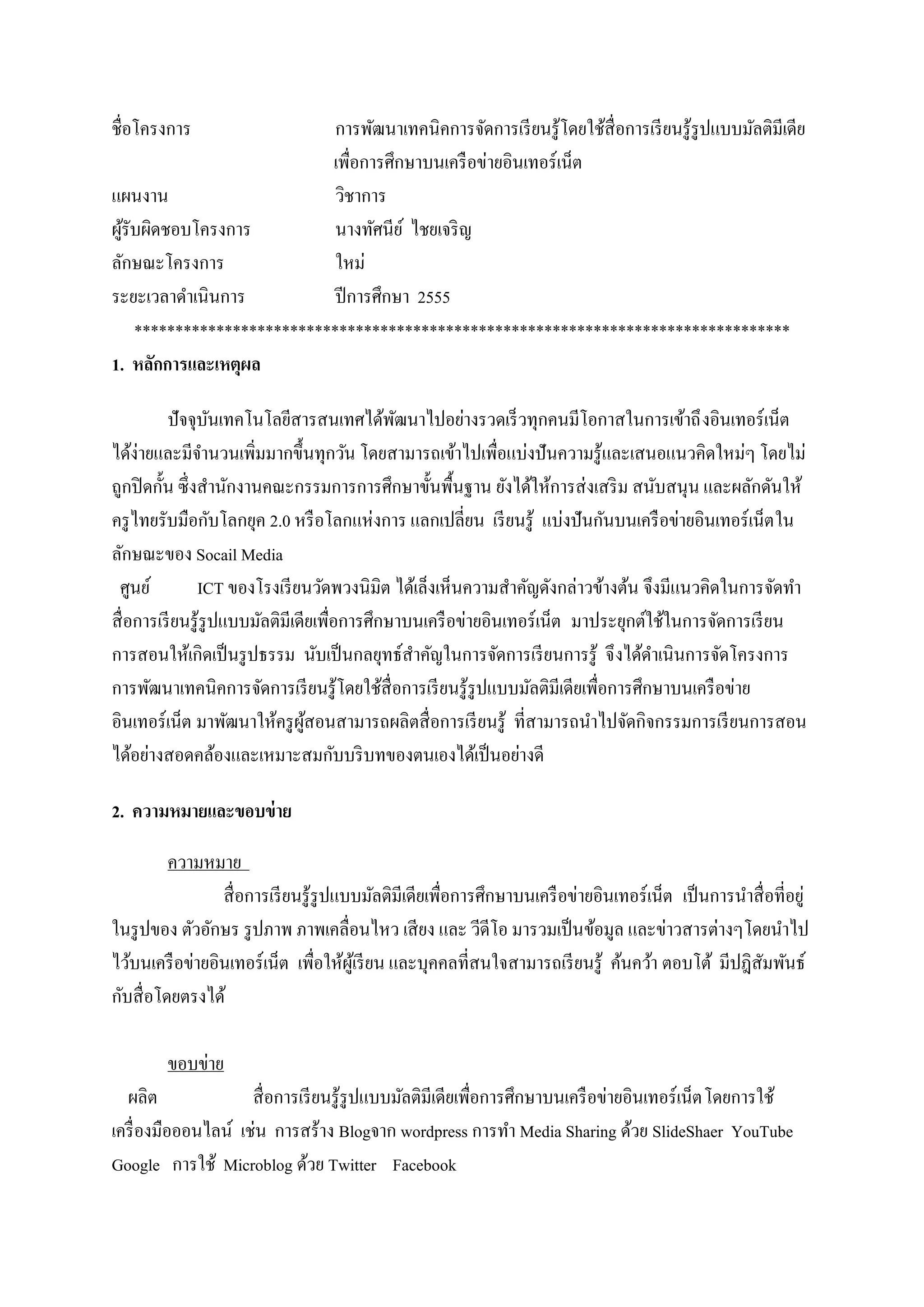 การพัฒนาเทคนิคการจัดการเรี ยนรู ้โดยใช้สื่อการเรี ยนรู ้รูปแบบมัลติมีเดีย เพื่อการศึกษาบนเครื อข่ายอินเทอร์เน็ต แผนงาน วิชาการ ผูรับผิดชอบโครงการ ้ นางทัศนีย ์ ไชยเจริ ญ ลักษณะโครงการ ใหม่ ระยะเวลาดําเนินการ ปี การศึกษา 2555 ******************************************************************************** 1. หลกการและเหตุผล ั ปั จจุบนเทคโนโลยีสารสนเทศได้พฒนาไปอย่างรวดเร็ วทุกคนมีโอกาสในการเข้าถึ งอินเทอร์เน็ต ั ั ไดง่ายและมีจานวนเพิ่มมากข้ ึนทุกวน โดยสามารถเขาไปเพื่อแบ่งปันความรู้และเสนอแนวคิดใหม่ๆ โดยไม่ ้ ํ ั ้ ั ถูกปิดก้ น ซ่ ึงสํานักงานคณะกรรมการการศึกษาขั้นพื้นฐาน ยังได้ให้การส่ งเสริ ม สนับสนุน และผลักดันให้ ครู ไทยรับมือกับโลกยุค 2.0 หรือโลกแห่งการ แลกเปลี่ยน เรียนรู้ แบ่งปันกนบนเครือขายอินเทอร์เน็ต ใน ั ่ ลักษณะของ Socail Media ศูนย์ ICT ของโรงเรี ยนวัดพวงนิมิต ได้เล็งเห็นความสําคัญดังกล่าวข้างต้น จึงมีแนวคิดในการจดทา ั ํ สื่อการเรียนรู้รูปแบบมลติมีเดียเพื่อการศึกษาบนเครือข่ายอินเทอร์เน็ต มาประยุกต์ใช้ในการจัดการเรี ยน ั การสอนใหเ้ กิดเป็นรูปธรรม นบเป็นกลยทธ์สาคญในการจัดการเรี ยนการรู ้ จึ งได้ดาเนินการจัดโครงการ ั ุ ํ ั ํ การพัฒนาเทคนิคการจัดการเรี ยนรู ้โดยใช้สื่อการเรี ยนรู ้รูปแบบมัลติมีเดียเพื่อการศึกษาบนเครื อข่าย อินเทอร์เน็ต มาพัฒนาให้ครู ผสอนสามารถผลิตสื่ อการเรี ยนรู ้ ที่สามารถนําไปจัดกิจกรรมการเรี ยนการสอน ู้ ได้อย่างสอดคล้องและเหมาะสมกับบริ บทของตนเองได้เป็ นอย่างดี 2. ความหมายและขอบข่ าย ความหมาย สื่อการเรียนรู้รูปแบบมลติมีเดียเพื่อการศึกษาบนเครือข่ายอินเทอร์เน็ต เป็นการนาสื่อที่อยู่ ั ํ ในรู ปของ ตวอกษร รู ปภาพ ภาพเคลื่อนไหว เสี ยง และ วดีโอ มารวมเป็ นข้อมูล และข่าวสารต่างๆโดยนําไป ั ั ี ไวบนเครือข่ายอินเทอร์เน็ต เพื่อใหผเู ้ รียน และบุคคลที่สนใจสามารถเรียนรู้ คนควา ตอบโต้ มีปฎิสัมพันธ์ ้ ้ ้ ้ ั กบสื่อโดยตรงได้ ขอบข่าย ผลิต สื่อการเรียนรู้รูปแบบมลติมีเดียเพื่อการศึกษาบนเครือข่ายอินเทอร์เน็ต โดยการใช้ ั เครื่องมือออนไลน์ เช่น การสร้าง Blogจาก wordpress การทํา Media Sharing ดวย SlideShaer YouTube ้ Google การใช้ Microblog ดวย Twitter Facebook ้