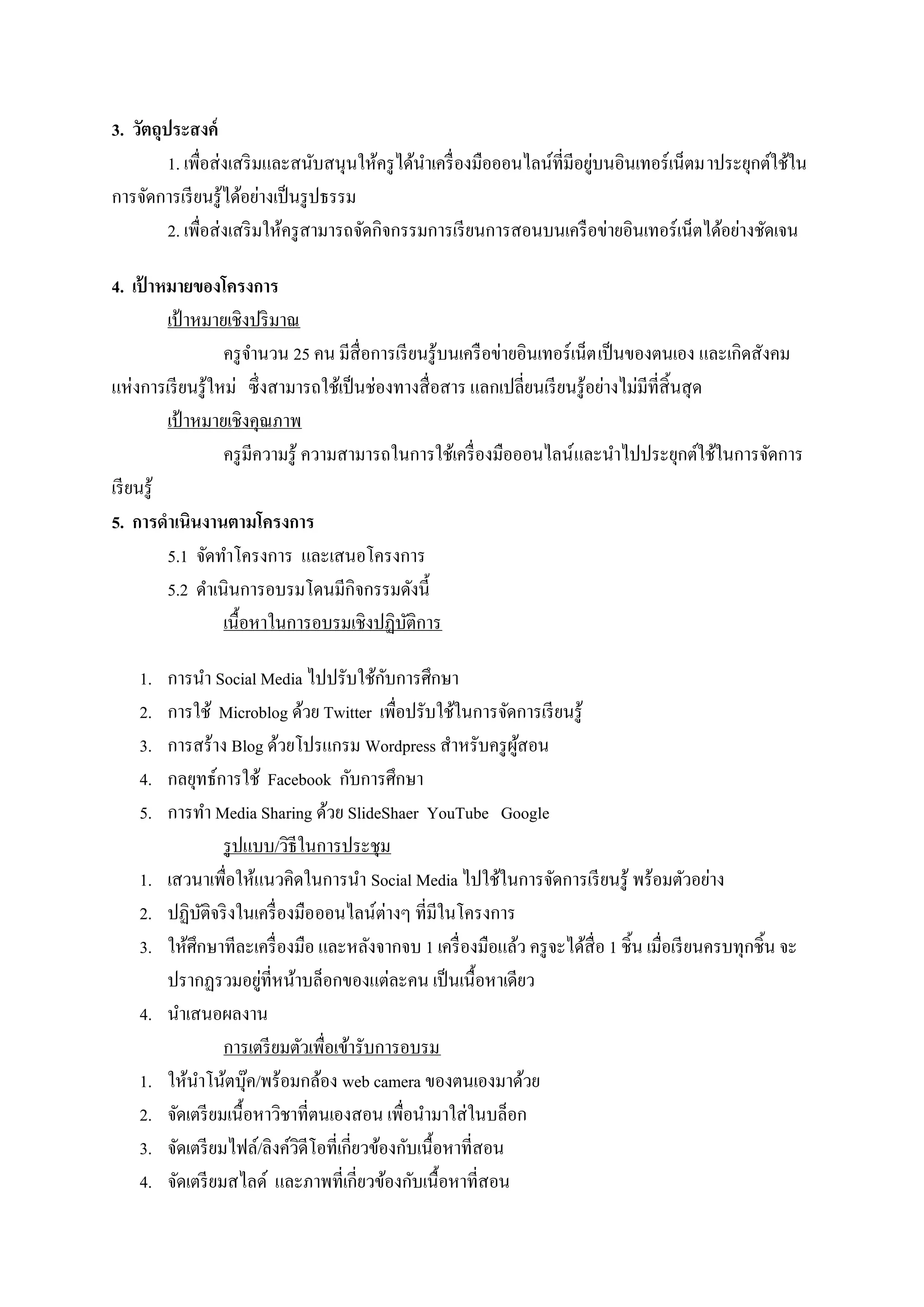 1. เพื่อส่งเสริมและสนบสนุนใหครูไดนาเครื่องมือออนไลน์ที่มีอยบนอินเทอร์เน็ตมาประยุกต์ใช้ใน ั ้ ้ ํ ู่ การจัดการเรี ยนรู ้ได้อย่างเป็ นรู ปธรรม 2. เพื่อส่ งเสริ มให้ครู สามารถจัดกิจกรรมการเรี ยนการสอนบนเครื อข่ายอินเทอร์ เน็ตได้อย่างชัดเจน 4. เปาหมายของโครงการ ้ เป้ าหมายเชิงปริ มาณ ครูจานวน 25 คน มีสื่อการเรียนรู้บนเครือข่ายอินเทอร์เน็ต เป็นของตนเอง และเกิดสังคม ํ แห่งการเรี ยนรู ้ใหม่ ซึ่ งสามารถใช้เป็ นช่องทางสื่ อสาร แลกเปลี่ยนเรี ยนรู ้อย่างไม่มีที่สิ้นสุ ด เป้ าหมายเชิงคุณภาพ ครู มีความรู ้ ความสามารถในการใช้เครื่ องมือออนไลน์ และนําไปประยุกต์ใช้ในการจัดการ เรียนรู้ 5. การดําเนินงานตามโครงการ 5.1 จัดทําโครงการ และเสนอโครงการ 5.2 ดําเนินการอบรมโดนมีกิจกรรมดังนี้ เน้ือหาในการอบรมเชิงปฏิบติการ ั 1. การนํา Social Media ไปปรับใช้กบการศึกษา ั 2. การใช้ Microblog ดวย Twitter เพื่อปรับใช้ในการจัดการเรี ยนรู ้ ้ 3. การสร้าง Blog ดวยโปรแกรม Wordpress สําหรับครู ผสอน ้ ู้ 4. กลยทธ์การใช้ Facebook กับการศึกษา ุ 5. การทํา Media Sharing ดวย SlideShaer YouTube Google ้ รู ปแบบ/วธีในการประชุม ิ 1. เสวนาเพื่อใหแนวคิดในการนา Social Media ไปใช้ในการจัดการเรี ยนรู ้ พร้อมตัวอย่าง ้ ํ 2. ปฏิบติจริ งในเครื่ องมือออนไลน์ต่างๆ ที่มีในโครงการ ั 3. ให้ศึกษาทีละเครื่ องมือ และหลังจากจบ 1 เครื่องมือแลว ครูจะไดสื่อ 1 ชิ้น เมื่อเรียนครบทุกชิ้น จะ ้ ้ ่ ปรากฏรวมอยูที่หน้าบล็อกของแต่ละคน เป็ นเนื้อหาเดียว 4. นําเสนอผลงาน การเตรี ยมตัวเพื่อเข้ารับการอบรม 1. ใหนาโนตบุค/พร้อมกลอง web camera ของตนเองมาด้วย ้ ํ ้ ๊ ้ 2. จดเตรียมเน้ือหาวชาที่ตนเองสอน เพื่อนามาใส่ในบล็อก ั ิ ํ 3. จัดเตรี ยมไฟล์/ลิงควดีโอที่เกี่ยวของกบเน้ือหาที่สอน ์ิ ้ ั 4. จดเตรียมสไลด์ และภาพที่เกี่ยวของกบเน้ือหาที่สอน ั ้ ั