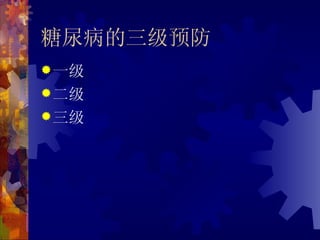 本文件讨论了糖尿病的防治策略,包括三级预防和五项主要措施,同时强调糖尿病患者的饮食和运动治疗的重要性。文中提供了详细的热量控制标准和运动强度及其对健康的影响,并强调了自我管理和监测的重要性,以防止并发症和改善生活质量。最后,涉及足部、眼部及肾脏的护理和监测注意事项,强调健康生活习惯对糖尿病管理的积极作用。