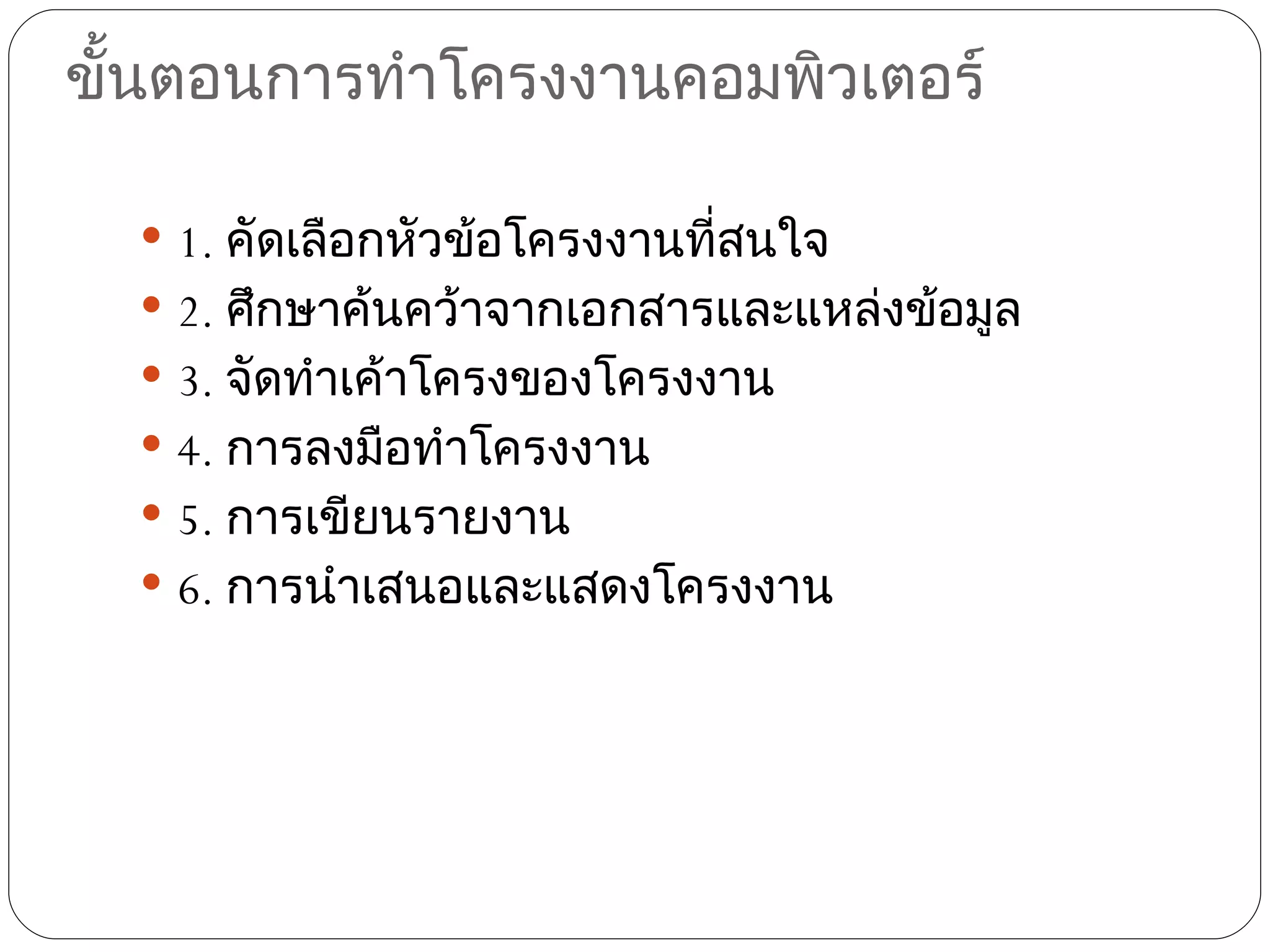 ขั้นตอนการทำาโครงงานคอมพิวเตอร์