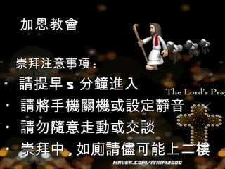 加恩教會致力於尊重和敬拜真神,並在崇拜中提供注意事項以維持秩序和敬虔。教會強調信心的重要性,並通過詩歌表達對主的渴望與感恩,希望每位信徒能在困難中感受到主的愛與陪伴。信徒們被鼓勵回歸上帝,體驗祂的恩典與指引。