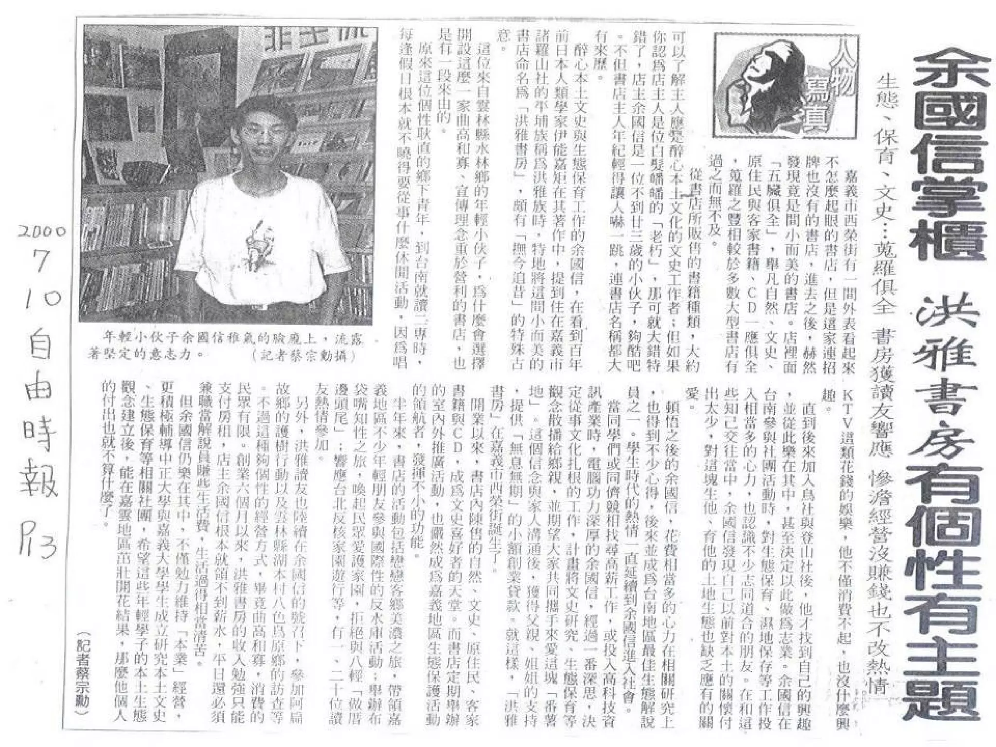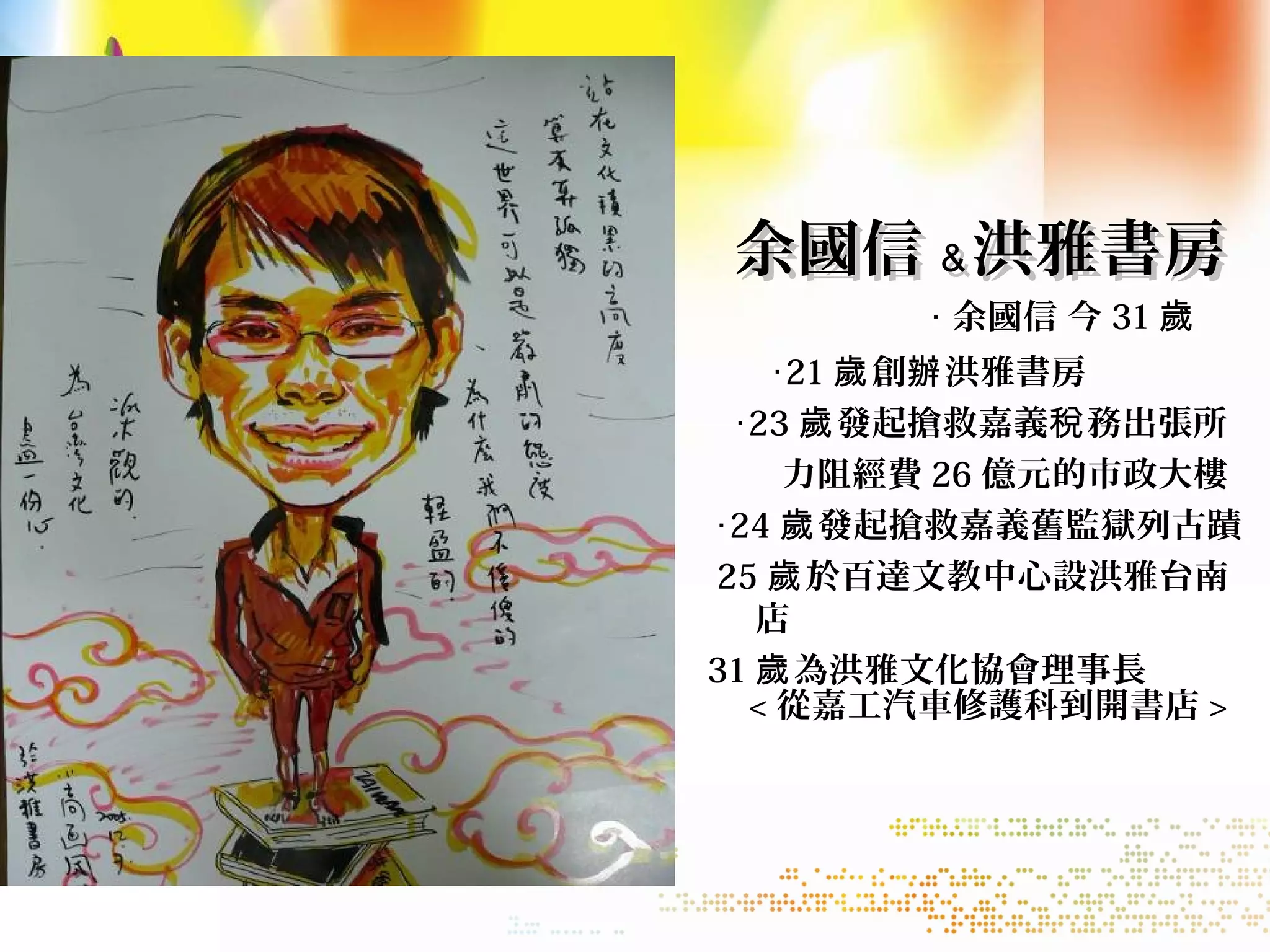 余國信 今 31 歲 ‧21 創 洪雅書房歲 辦 ‧23 發起搶救嘉義 務出張所歲 稅 力阻經費 26 億元的市政大樓 ‧24 發起搶救嘉義舊監獄列古蹟歲 25 於百達文教中心設洪雅台南歲 店 31 為洪雅文化協會理事長歲 < 從嘉工汽車修護科到開書店 >