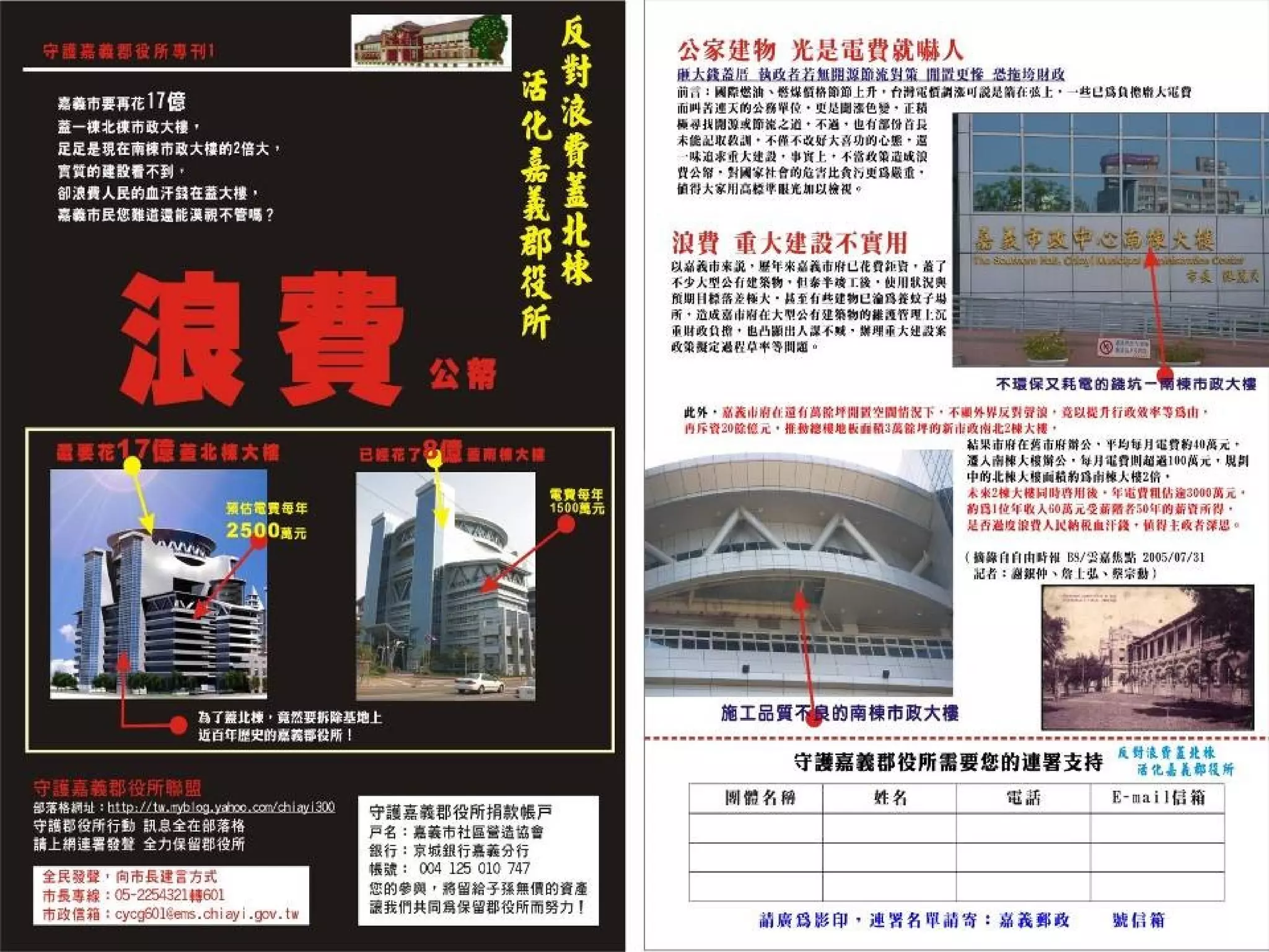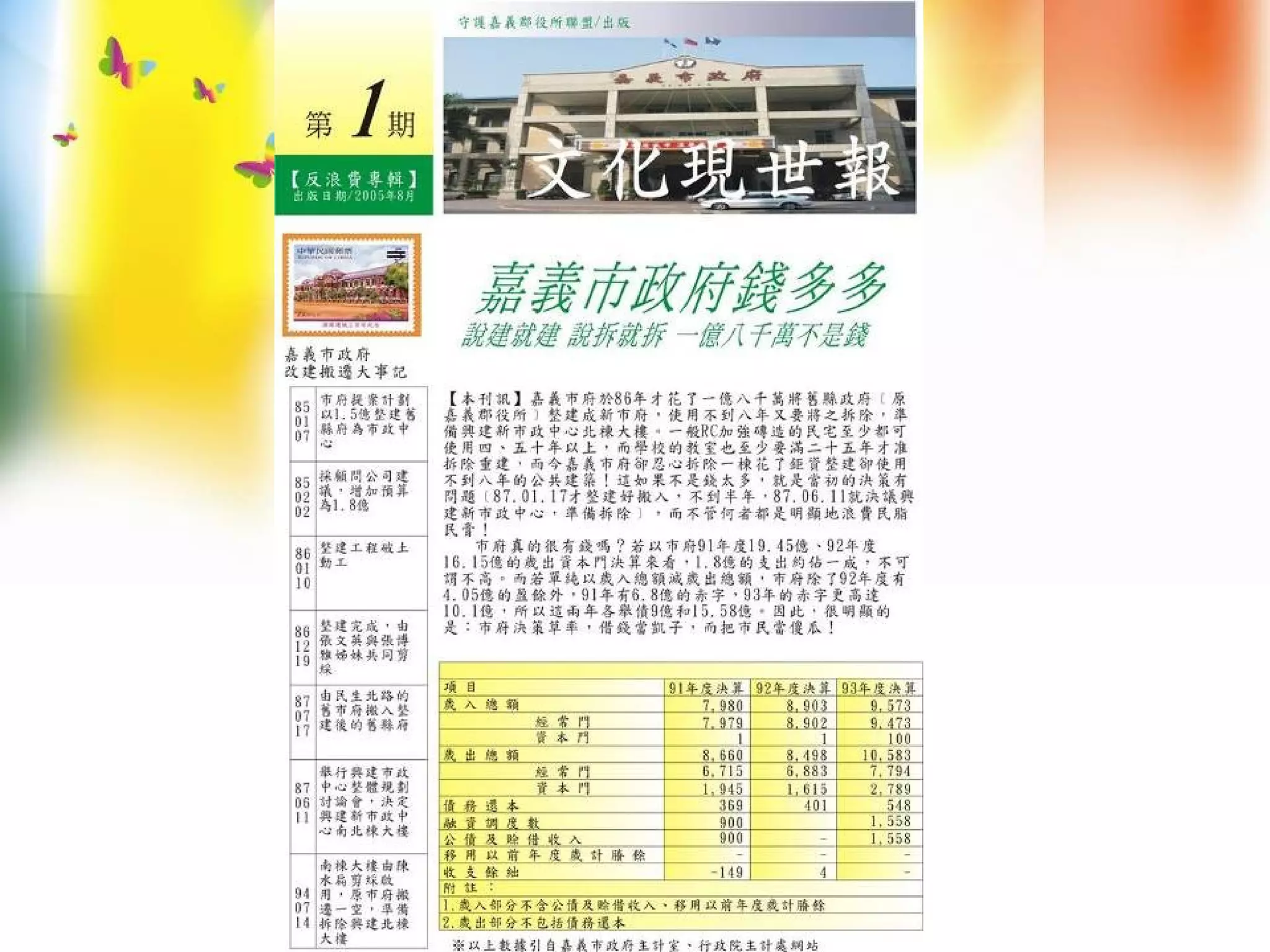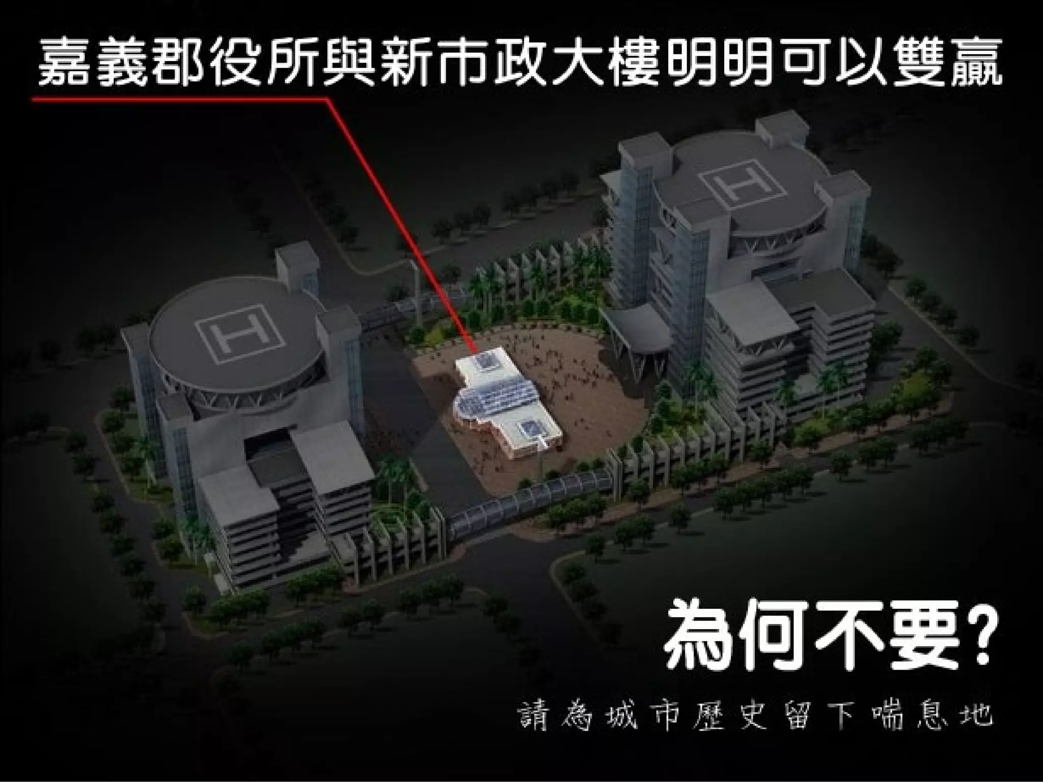 1933 年七月完工 • 1941 年嘉義中埔 7.1 級大地震完好保存下 來 • 1945 年二次大戰砲 火無恙 • 戰後為嘉義縣議會 • 2000 年欲拆除蓋 26 億元南北棟市政大樓 • 從 2001 年 5 月起 嘉義文化運動開始