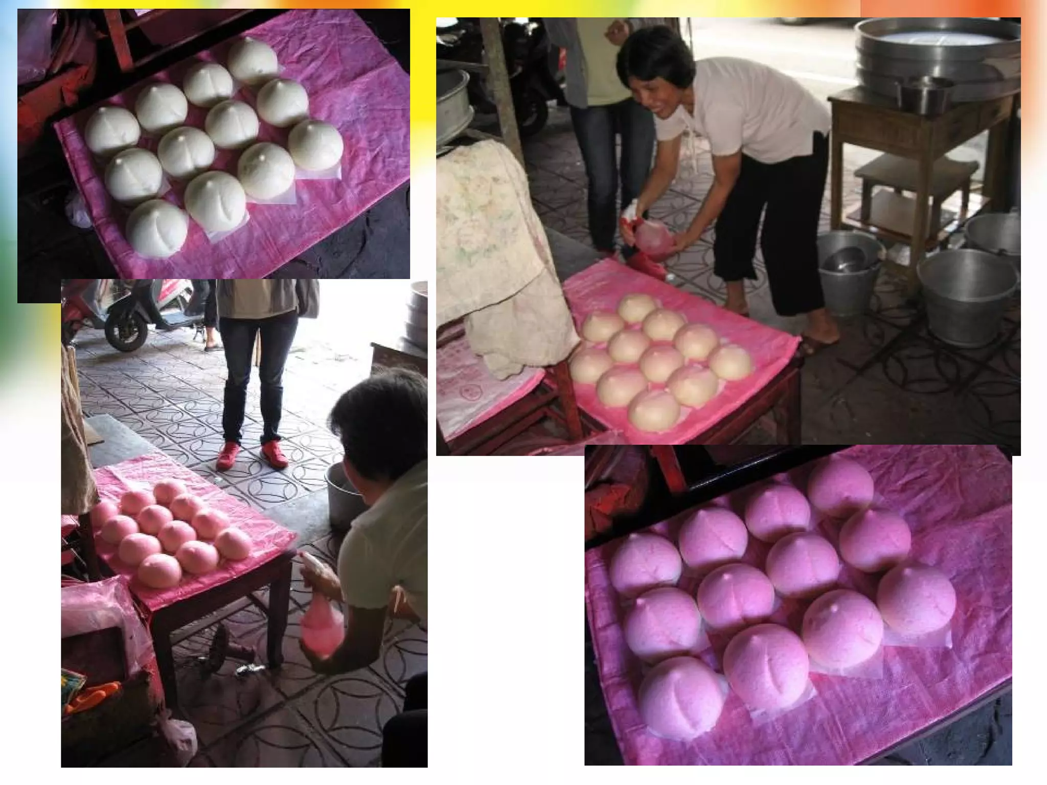 另外他們也有承包做壽桃包子,通常是接外面的廠商委託才做,平常是不賣這種包子。 在炊好包子之後,在上面噴上些許的食用紅色素,就算完工。