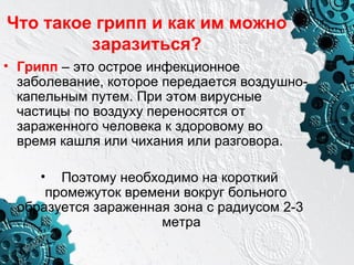 Презентация ученицы гимназии 23 описывает грипп как острое инфекционное заболевание, передающееся воздушно-капельным путем, и перечисляет его симптомы, включая повышение температуры и головную боль. Грипп может приводить к серьезным осложнениям и требует внимания врача, с особым акцентом на профилактические меры, такие как ношение маски и соблюдение гигиены. Документ также содержит советы по уходу за больными и важность ограничения контактов для предотвращения распространения вируса.