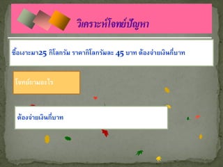 บาท ต้องจ่ายเงินกี่บ าท าไร ซือ ่องซักผ้าราคา ลกรัม ราคาก แพงกว่า ้เย็น 5,360 บาท ตู้เย็นราคาเท่ ้ โจทย์กาหนดอะไรมาให้บ้าง • สถานที่เกิด ซือเงาะมา ้ 25 กิโลกรัม ราคากิโลกรัมละ 45 บาท