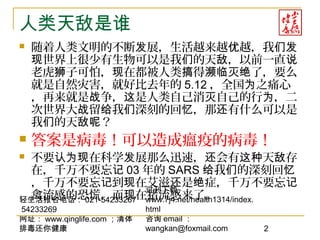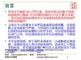 该文档探讨了猪流感和流感病毒对人类健康的威胁,强调流感历史及其传播机制的严重性。文中提到人类在应对流感疫情时应提高警惕并采取预防措施,同时也介绍了增强免疫力的方法。最后,文档呼吁公众在疫情来临时保持冷静并注意个人卫生。