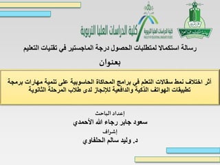 تتناول الوثيقة تأثير استخدام برامج المحاكاة على تطوير مهارات البرمجة لدى طلاب المرحلة الثانوية وتعزيز دافعيتهم للإنجاز. يشير الباحث إلى أهمية تقنيات التعليم الإلكترونية وتفاعلها مع المتعلم لتوفير بيئة تعليمية فعالة. كما تستعرض الوثيقة مشكلات تطبيق التكنولوجيا في التعليم وما قد ينجم عنها من تحديات في الدافعية والأداء الأكاديمي.