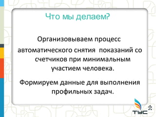 Документ описывает территориальные учетные системы, предназначенные для автоматизации процесса снятия показаний со счетчиков с минимальным участием человека. Система включает оборудование, обеспечивающее передачу данных через различные каналы связи и поддерживающее интеграцию с биллинговыми системами, а также возможности онлайн-контроля и мониторинга. Гарантированный срок эксплуатации оборудования составляет до 15 лет, а эксплуатационные затраты составляют менее 50 копеек на абонента в месяц.