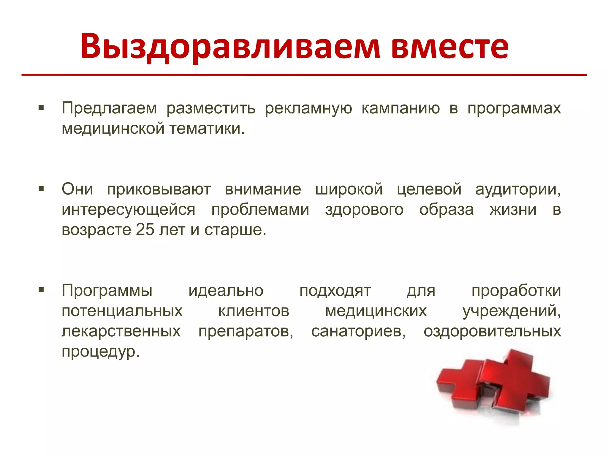 Документ представляет собой предложение рекламной кампании 'выздоравливаем вместе', нацеленной на программы медицинской тематики, чтобы привлечь внимание аудитории старше 25 лет, заинтересованной в здоровом образе жизни. Включает графики выхода и рейтинги различных программ, а также ценовые условия для размещения рекламы. Ключевыми программами являются 'интерны' и 'медицинские тайны', предлагающие высокую контактность с потенциальными клиентами в области медицины.