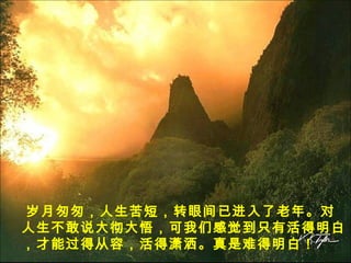 这篇文章讨论了老年生活的意义与价值,强调要活得明白、快乐以及珍惜当下。倡导从容面对人生的缺憾,积极调整心态,享受生活中的小确幸,并鼓励老年人参与社会活动以提升生活质量。最后提到,人生的最终目标是追求身心健康和幸福,而不是盲目追求物质。