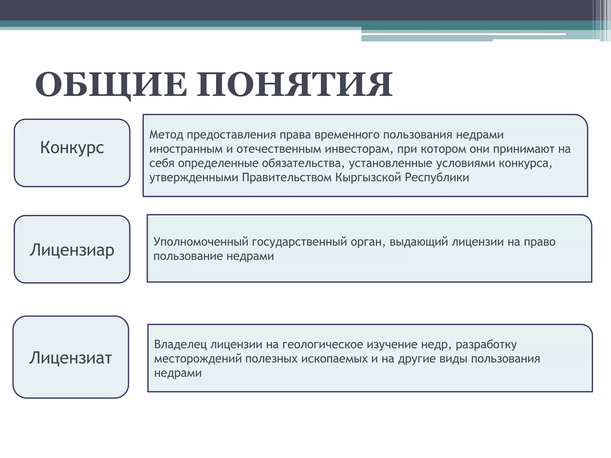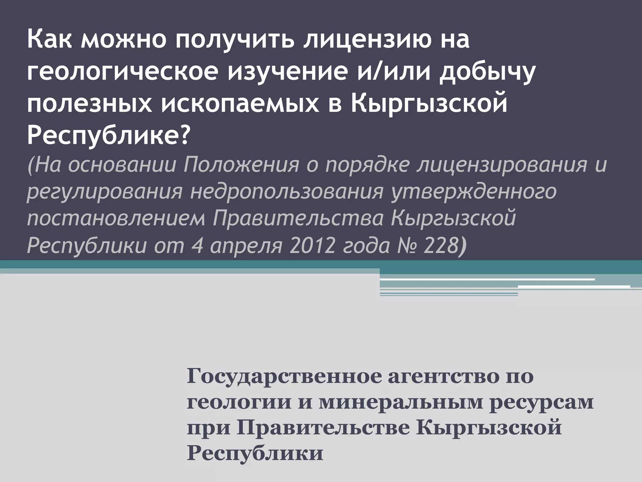 Документ описывает процесс получения лицензии на геологическое изучение и добычу полезных ископаемых в Кыргызстане, включая условия участия в конкурсах и аукционах. Указывается, что лицензии предоставляются как иностранным, так и отечественным инвесторам на равных условиях, а процесс включает подачу заявки и уплату различных сборов. Также освещаются требования к документам и действиям в случае отказа в лицензии.