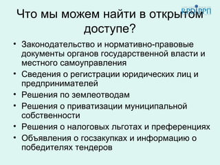 Документ описывает доступные открытые источники информации в интернете, которые могут использовать журналисты, включая законодательные и нормативные документы, данные о юридических лицах, налоговые льготы, судебные решения и информацию о государственных закупках. Также рассматриваются базы данных и реестры в различных областях, таких как здравоохранение и финансы. В итоге, документ подчеркивает важность открытых данных для работы в журналистике.