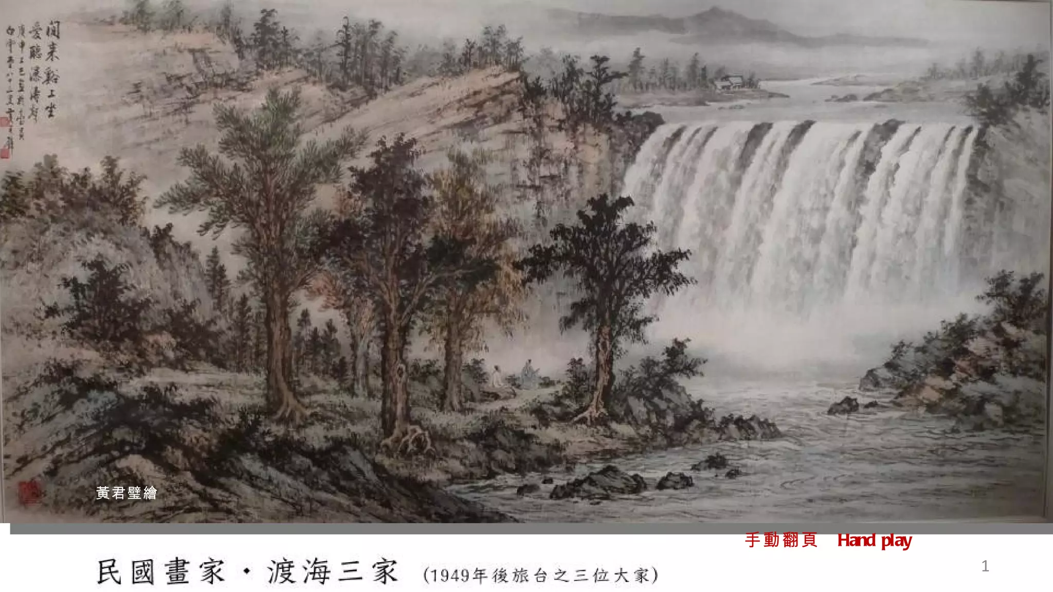 黃君璧,原名韞之,號君璧。祖籍 廣東省南海縣,家境富裕,家中古 董字畫收藏豐盛。少年時一直就讀 於家中的私館,後於 1 91 9 年畢業 於廣東公學,頗喜觀賞字畫收 藏。 1 7 歲拜師李瑤屏習畫, 1 921 年經李瑤屏推薦,任教於廣州培正 中學,開始走上繪畫教學崗 位。 1 922 年在楚庭美術院研究西 畫。 1 927 年又任廣州市立美術專 科學校教務長。 1 937 年任徐悲鴻 主持的中央大學美術系教授,與徐 悲鴻共同執教達 1 1 年。一生為中 國美術教育事業做出巨大貢 獻。 1 949 年,黃君璧遷居台灣, 任台灣師範學院﹝今師範大學﹞藝術系 教授,主任。多次在台北,加拿大 ,美國,新加坡,南韓舉辦個人畫 展。 1 968 年獲紐約聖若望大學學 質獎章。出版有《黃君壁畫集》, 《黃君壁書畫集》,《黃君壁作品 選集》,《白雲堂藏畫》等。 • 黃君璧善畫山水,傳統功底深厚, 他經歷了現代中國畫的繼承,演變 ,革新的全過程。他從學中國畫之 日起就兼學西畫,是一個通西畫的 中國畫家,在西方藝術界他被稱為 「中國新古典派」。 3
