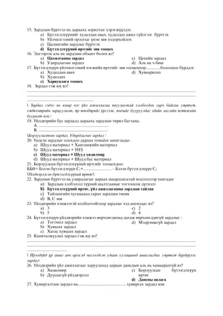 нь дараахь зорилтыг хэрэгжүүлдэг. a) Бүтээгдэхүүнийг худалдан авах, худалдах ажил гүйлгээг бүртгэх b) Үйлчилгээний орлогыг үнэн зөв тодорхойлох c) Цалингийн зардлыг бүртгэх d) Бүтээгдэхүүний өртгийг зөв тооцох 16. Эдгээрээс аль нь зардлын объект болох вэ? a) Цахилгааны зардал b) Удирдлагын зардал c) Цехийн зардал d) Аль нь ч биш 17. Бүтээгдэхүүн үйлчилгээний нэгжийн өртгийг зөв тооцсноор.............бололцоо бүрддэг. a) Худалдан авах b) Худалдах c) Хариуцлага тооцох d) Хуваарилах 18. Зардал гэж юу вэ? ....................................................................................................................................................... ....................................................................................................................................................... ............................................................ Зардал гэдэг нь ямар нэг үйл ажиллагаа явуулахтай холбогдон гарч байгаа хөрөнгө, хөдөлмөрийн зарцуулалт, өр төлбөрийг үүсгэж, өмчийг бууруулдаг эдийн засгийн өгөөжийн бууралт юм. 19. Үйлдвэрийн бус зардалд дараахь зардлын төрөл багтана. А. .............................................................. В. .............................................................. Борлуулалтын зардал, Удирдлагын зардал 20. Үндсэн зардлыг олохдоо дараах томьёог ашигладаг. a) Шууд материал + Хангамжийн материал b) Шууд материал + ҮНЗ c) Шууд материал + Шууд хөдөлмөр d) Шууд материал + Шууд бус материал 21. Борлуулсан бүтээгдэхүүний өртгийг тооцохдоо: ББӨ= Бэлэн бүтээгдэхүүн С1+......................... – Бэлэн бүтээгдэхүүн С2 Үйлдвэрлэсэн бүтээгдэхүүний өртөг 22. Зардлын бүртгэл нь удирдлагыг дараах шаардлагатай мэдээллээр хангадаг a) Зардлын хэлбэлзэл түүний шалтгааныг тогтоосон дүгнэлт b) Бүтээгдэхүүний өртөг, үйл ажиллагааны зардлын тайлан c) Тайлангийн хугацаанд гарах зардлын төсөв d) B, C зөв 23. Үйлдвэрийн хэмжээтэй холбоотойгоор зардлыг хэд ангилдаг вэ? a) 3 b) 5 c) 2 d) 4 24. Бүтээгдэхүүн үйлдвэрийн хэмжээ өөрчлөгдөхөд дагаж өөрчлөгддөгүй зардлыг : a) Тогтмол зардал b) Хувьсах зардал c) Хагас хувьсах зардал d) Мэдрэмжгүй зардал 25. Капиталжуулах зардал гэж юу вэ? ....................................................................................................................................................... ....................................................................................................................................................... .................................... Ирээдүйд үр ашиг авч ирэхэд чиглэгдсэн удаан хугацаанд ашиглагдах хөрөнгө бүрдүүлэх зардал 26. Үйлдвэрийн үйл ажиллагааг харуулахад дараах дансдын аль нь хамаарахгүй вэ? a) Хөдөлмөр b) Дуусаагүй үйлдвэрлэл c) Борлуулсан бүтээгдэхүүн өртөг d) Дансны авлага 27. Хувиргалтын зардал нь........................................... хувиргах зардал юм.