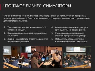 Документ описывает разработку компьютерных бизнес-симуляторов, которые моделируют экономические ситуации и позволяют участникам управлять виртуальными компаниями. Симуляторы используются в различных форматах, включая онлайн-соревнования и очные финалы, и предназначены для студентов, аспирантов и сотрудников компаний с целью развития управленческих навыков. Процесс разработки включает адаптацию существующих решений и создание специализированных сценариев, с акцентом на гибкость и интеграцию с другими обучающими технологиями.