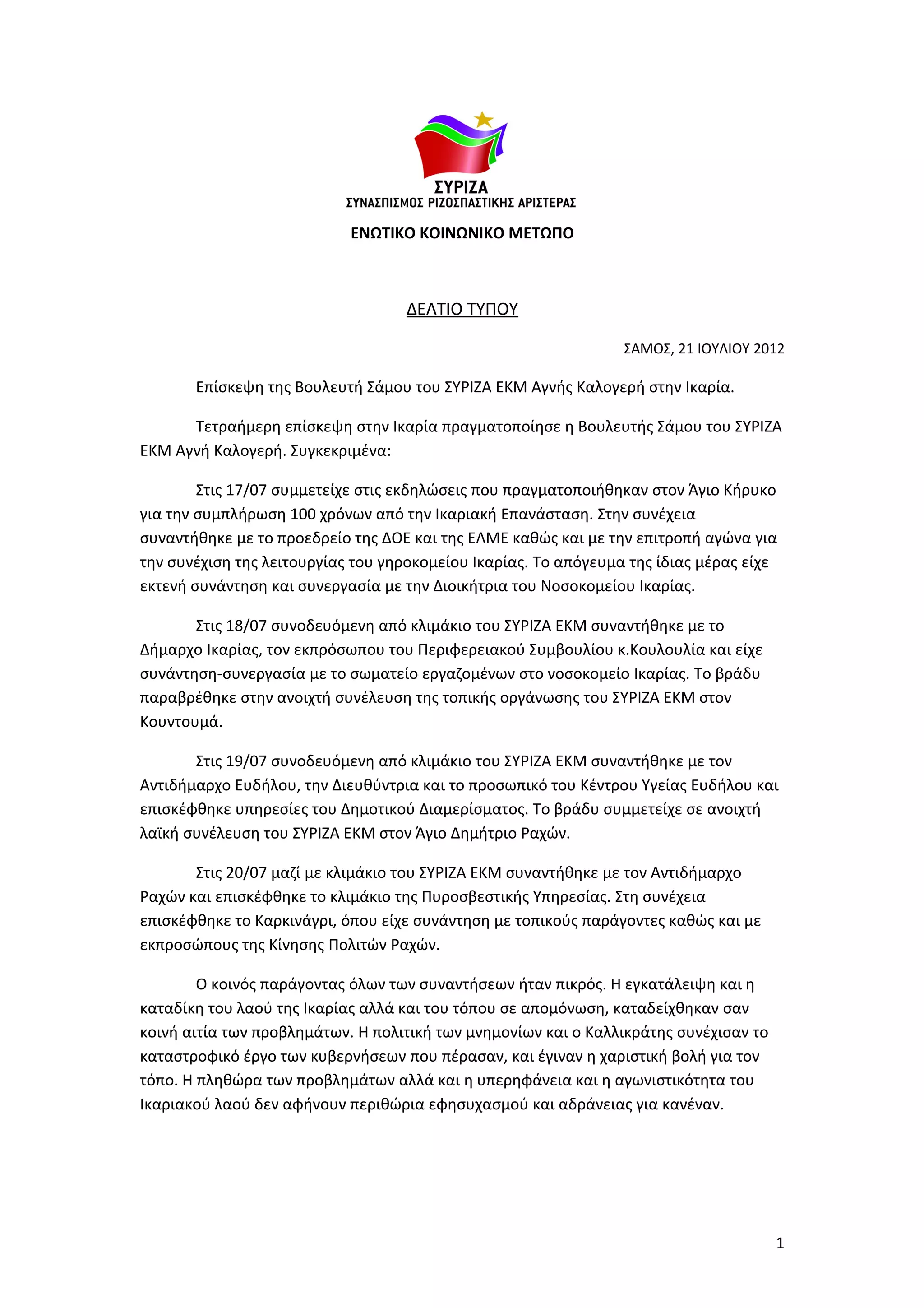Τετραήμερη επίσκεψη στην Ικαρία πραγματοποίησε η Βουλευτής Σάμου του ΣΥΡΙΖΑ