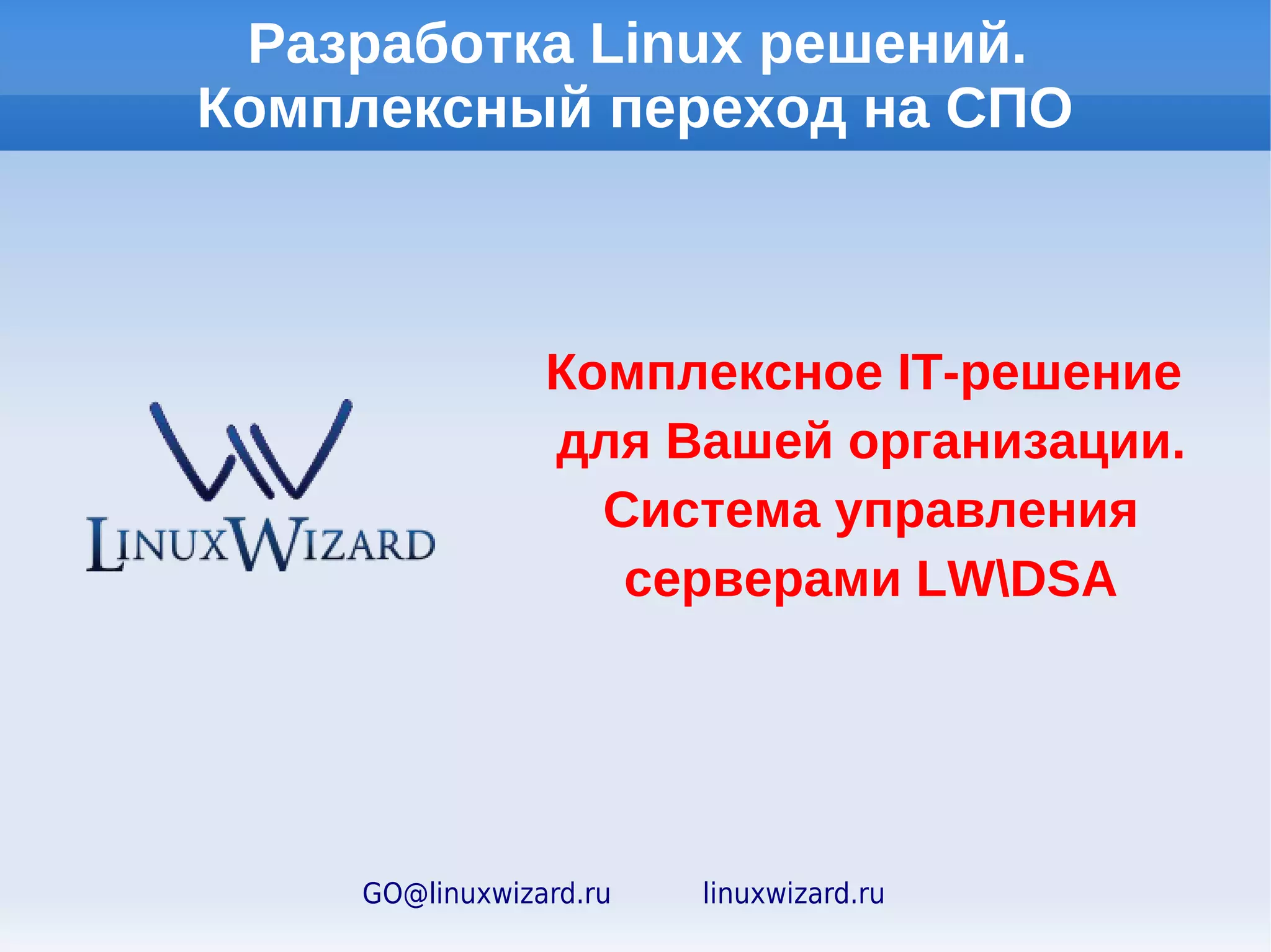 Документ представляет собой предложение комплексного IT-решения от компании LinuxWizard для организаций, включая серверные и клиентские решения, дистанционное обучение и техническую поддержку. Описаны услуги по установке и настройке систем, а также обучение специалистов. Также рассматриваются различные тарифы и преимущества использования предложенных решений по сравнению с альтернативами на основе Windows.