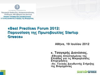 Η παρουσίαση του Δ. Τσαγκρή (Eθνικού Aπεσταλμένου της Ελλάδας για τις μικρομεσαίες επιχειρήσεις, Υπουργείο Ανάπτυξης, Ανταγωνιστικότητας και Ναυτιλίας), όπως έγινε στο Συνέδριο του Best Practices Forum, στον Πολυχώρο the HUB events, στις 19 Ιουλίου 2012.