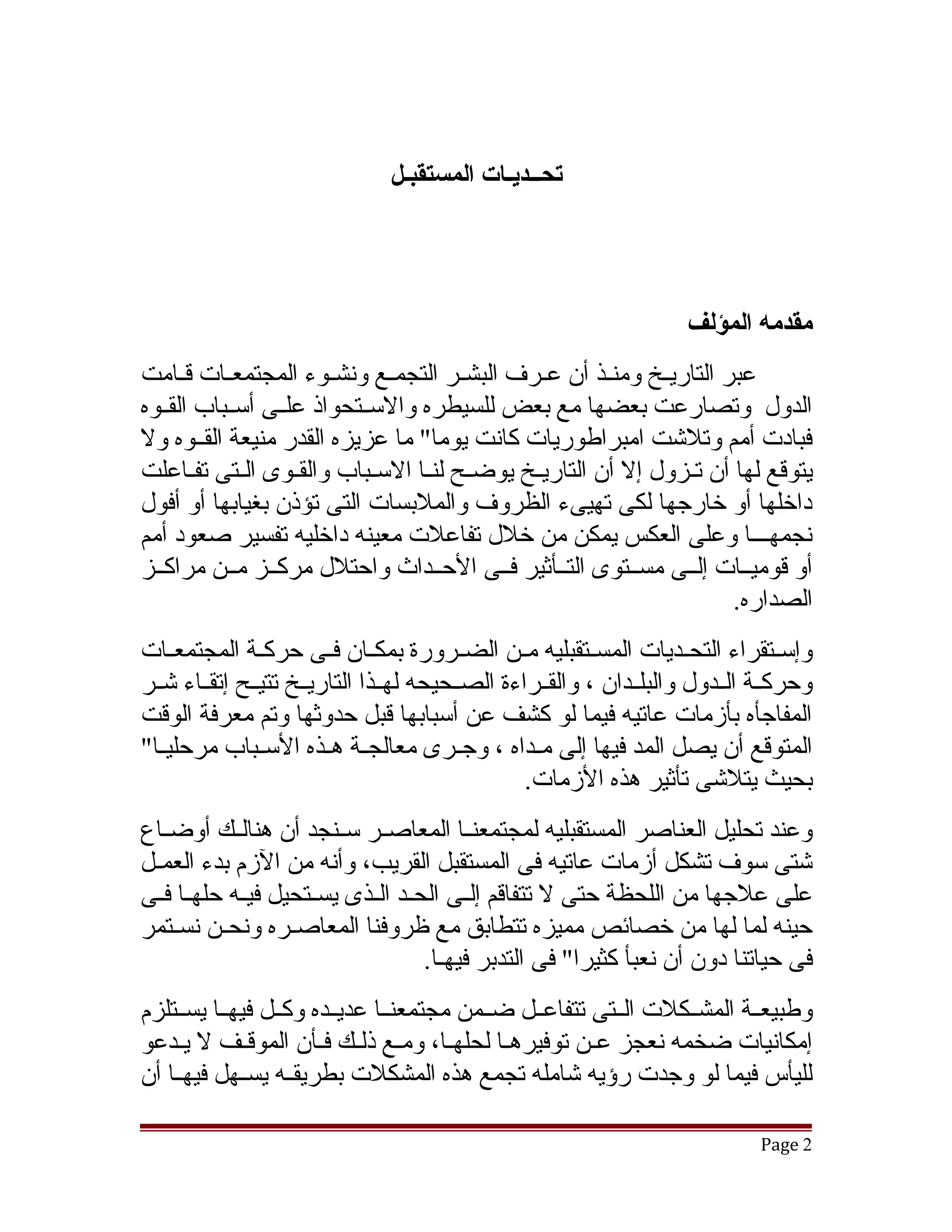 تناقش الوثيقة التحديات المستقبلية لزيادة السكان والتقدم التكنولوجي وتأثيرهما على البيئة وجودة الحياة. تقدم الوثيقة رؤية لحل المشكلات المحتملة من خلال تحليل العناصر المستقبلية ومشكلات المجتمعات المعاصرة. تؤكد على أهمية اتخاذ إجراءات عاجلة لتجنب تفاقم الأزمات البيئية والاجتماعية.
