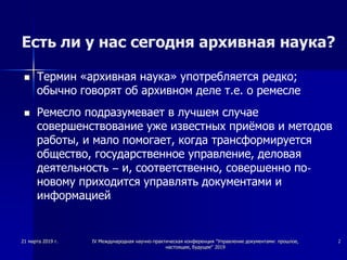 Документ посвящён IV международной научно-практической конференции по управлению документами, обсуждающей современное состояние архивной науки и её преобразования в условиях цифровой экономики. В нём поднимаются вопросы актуальности архивных технологий, необходимости переосмысления методов управления документами и возникающих проблем в делопроизводстве. Автор утверждает, что отсутствие современных подходов и знаний в области архивного дела может привести к дорогостоящим ошибкам при выполнении государственных программ.