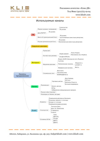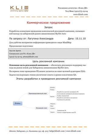 Документ представляет коммерческое предложение рекламного агентства «Клио ДВ» для авиакомпании Skynet Aero, направленное на поддержку её выхода на рынок Хабаровска. В документе описаны цели рекламной кампании, предполагаемые каналы продвижения и стратегические действия, включая телевидение, наружную, интернет-реклама и участие в мероприятиях. Особое внимание уделяется комплексному подходу к кампании и гарантии успешного выполнения работ.