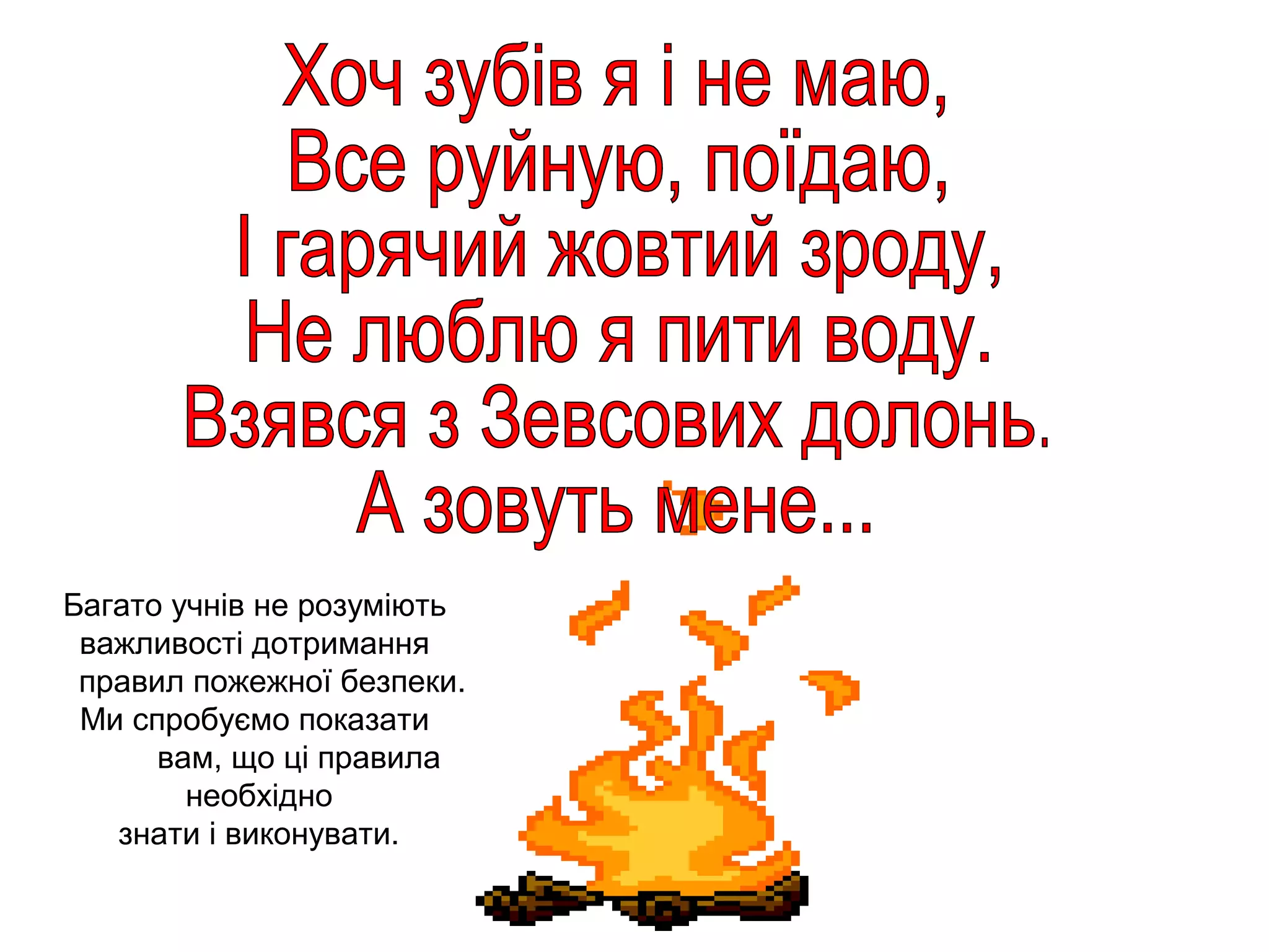 • Вогонь дуженебезпечний. Але тільки тоді, коли люди