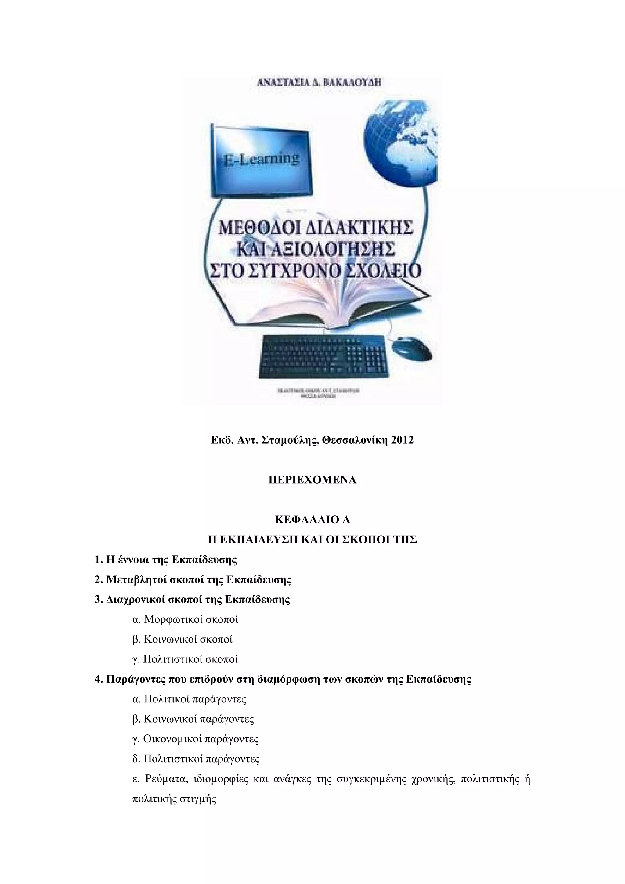 Το βιβλίο αυτό έχει ως στόχο να βοηθήσει κάθε εκπαιδευτικό να εφοδιαστεί με γνώσεις, μεθόδους, πρακτικές, μέσα και εργαλεία για τη βελτίωση της διδακτικής και παιδαγωγικής του ικανότητας, την αξιολόγηση του μαθητή και του εκπαιδευτικού έργου και να ανταποκριθεί στις απαιτήσεις του σύγχρονου αποτελεσματικού σχολείου.