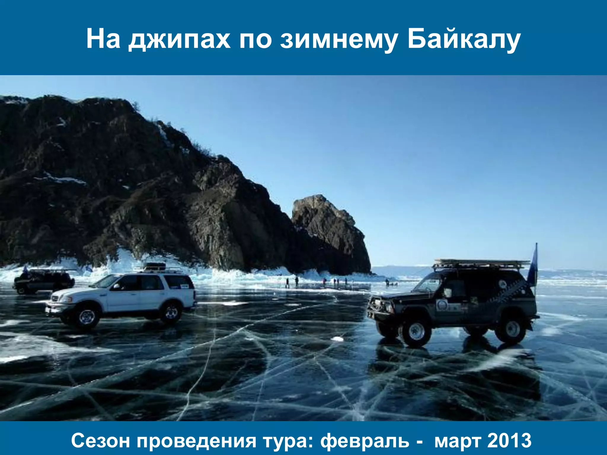 Документ описывает зимние туры по Байкалу, включая экскурсии на джипах и посещение достопримечательностей, таких как кругобайкальская железная дорога и остров Ольхон. Программа тура охватывает пять дней и включает различные активности, размещение в гостиницах и питание. Тур рассчитан на группу до 10 человек с возможностью организации дополнительных услуг, таких как ледяная баня и подледная рыбалка.