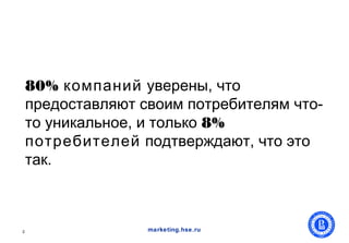 Документ обсуждает важность формирования конкурентных преимуществ компаний в цифровой среде, акцентируя внимание на опыте потребителей. По данным исследования, несмотря на уверенность компаний в уникальности своих предложений, лишь малая часть потребителей подтверждает это. Также подчеркивается необходимость позитивного опыта общения с брендом как ключевого фактора в потребительских отношениях.