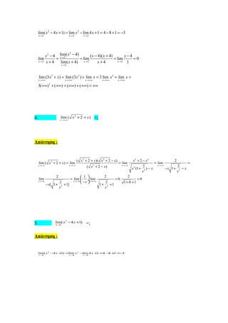 This document contains 7 limit problems worked out step-by-step with explanations of the reasoning. The problems involve various algebraic expressions containing polynomials, rational expressions, and variables approaching different limits. The solutions find the limits by simplifying the expressions, factorizing where possible, and evaluating the behavior of terms as the variable approaches the limit.