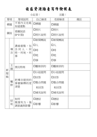 文档是关于社区资源踏查的写作检核表,总结了小记者在撰写新闻时需要关注的要点,包括标题、照片、新闻概说和观察情况等。通过自我检查与老师检查,确保内容的准确性和完整性。此外,还强调了提问、回答和总结的重要性,以增强新闻报道的深度与影响力。