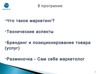 Документ рассматривает основы маркетинга, включая определение и важные аспекты, такие как брендинг и позиционирование. Он охватывает внутренний и внешний анализ рынка, а также методы исследования и факторы, влияющие на выбор потребителей. Основное внимание уделяется управлению производственно-сбытовой деятельностью и значимости понимания потребностей клиентов.