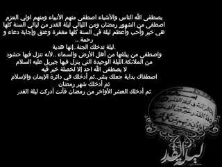 يتحدث النص عن فضل ليلة القدر واصطفاء الله للناس والأشياء، حيث يعتبرها أفضل ليلة في السنة لما تحمله من مغفرة ورحمة واستجابة للدعاء. يُذكر أن الله ينزل فيها الملائكة وجبريل عليه السلام، وتُحدد فيها الأقدار للعباد للعام القادم. النص يشير إلى ثواب أفعال المؤمنين في هذه الليلة، حيث يعادل العمل فيها كمن عمل لأكثر من أربعين سنة.