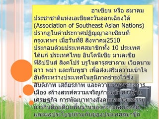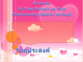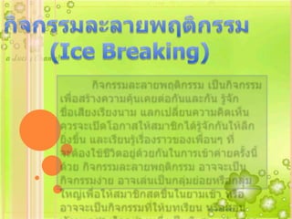 This document discusses icebreakers and group dynamics to build community among ASEAN nations. Activities will help participants understand each other's cultures and work together as one through interactive exercises and presentations on ASEAN values of cooperation and unity.