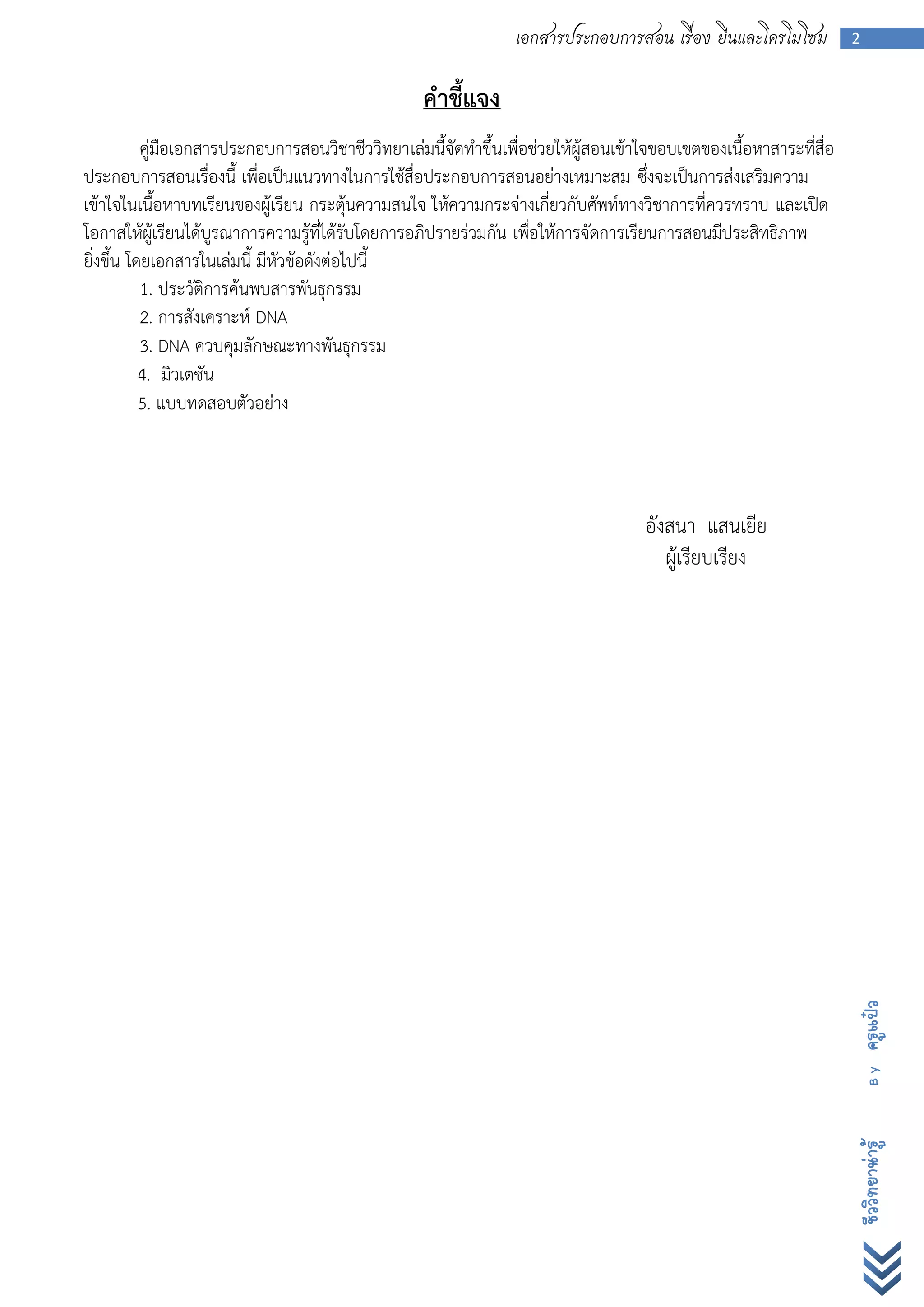 2 คาชี้แจง คู่มือเอกสารประกอบการสอนวิชาชีววิทยาเล่มนี้จัดทาขึ้นเพื่อช่วยให้ผู้สอนเข้าใจขอบเขตของเนื้อหาสาระที่สื่อ ประกอบการสอนเรื่องนี้ เพื่อเป็นแนวทางในการใช้สื่อประกอบการสอนอย่างเหมาะสม ซึ่งจะเป็นการส่งเสริมความ เข้าใจในเนื้อหาบทเรียนของผู้เรียน กระตุ้นความสนใจ ให้ความกระจ่างเกี่ยวกับศัพท์ทางวิชาการที่ควรทราบ และเปิด โอกาสให้ผู้เรียนได้บูรณาการความรู้ที่ได้รับโดยการอภิปรายร่วมกัน เพื่อให้การจัดการเรียนการสอนมีประสิทธิภาพ ยิ่งขึน โดยเอกสารในเล่มนี้ มีหัวข้อดังต่อไปนี้ ้ 1. ประวัติการค้นพบสารพันธุกรรม 2. การสังเคราะห์ DNA 3. DNA ควบคุมลักษณะทางพันธุกรรม 4. มิวเตชัน 5. แบบทดสอบตัวอย่าง อังสนา แสนเยีย ผูเรียบเรียง ้ ครูแป๋ว By ชีววิทยาน่ารู้